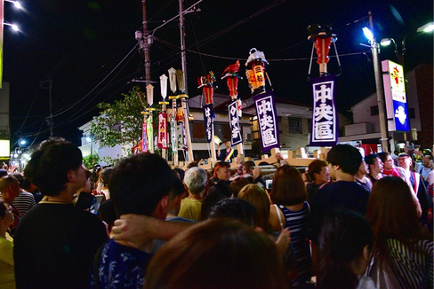 祭り会場の旧町内は猛暑にも負けない祭り参加者の熱気に包まれ下田太鼓を打ち鳴らしながら行列をなす一方で、若い衆による見事な「太鼓橋」。そして、中老による勇壮な神輿など見所満載!